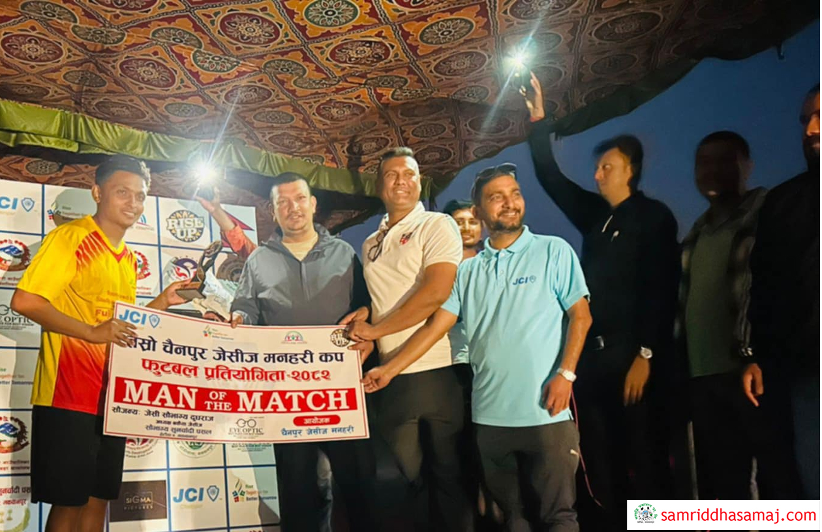 म्यान अफ द म्याच मकवानपुरगढीका गणेश हमाल घोषित भए । मकवानपुरगढी जेसीजले अब बिहीबार हुने पटिहानी इभेन्ट्स र गुरुशिष्य पाठशालाबीचको विजेतासँग १ गते फाइनल खेल्नेछ । चैनपुर जेसीज मनहरीको आयोजनामा २३ गतेबाट सन्चालन भइरहेको प्रतियोगिताको विजेताले एक लाख १ हजार एक सय ११ रुपैयाँ र उपविजेताले ५१ हजार एक सय ५१ रुपैयाँसहित ट्रफी, मेडल र प्रमाणपत्र प्राप्त गर्नेछ । यस्तै सर्वोत्कृष्ट खेलाडीले १० हजार र बाँकी विधागत उत्कृष्टले जनही नगद ५ हजार रुपैयाँसहित ट्रफी प्राप्त गर्नेछ ।