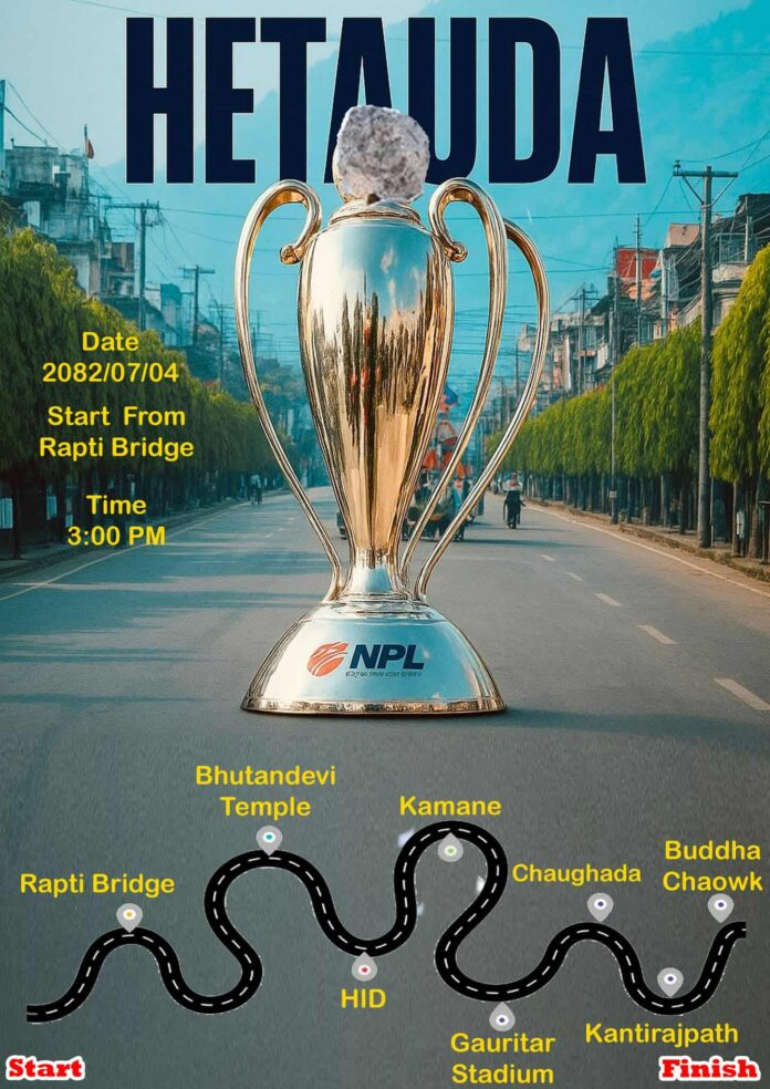 मकवानपुर जिल्ला क्रिकेट संघका सचिव बिनोद कुमार बानियाँका अनुसार आज मंगलबार दिउँसो ३ बजे हेटौँडा आइपुग्ने ट्रफी बजारक्षेत्रबाट हेटौँडा–६ स्थित गौरिटार रंगशाला पुर्याएर बुद्धचोकमा समापन गरिनेछ। ट्रफीसँगै चितवन राइनोजका खेलाडी पनि सहभागी हुने सचिव बानियाँको भनाइ छ। एनपिएलको पहिलो संस्करणको उपाधि जनकपुर बोल्ट्सले जितेको थियो। एनपिएलको दोस्रो संस्करण आगामी मंसिर १ गतेबाट सुरु हुँदैछ ।