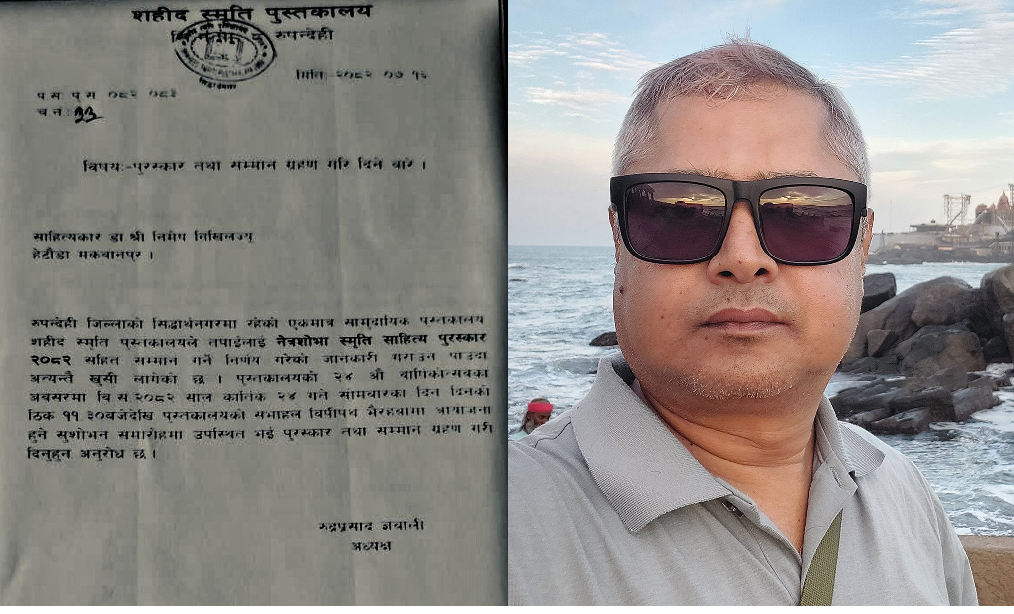 साहित्यकार वनमाली निराकरले आफ्नो अभिभावकको नाममा अक्षयकोष राखेर आयोजना गर्नुभएको नेत्र शोभा स्मृति साहित्य पुरस्कार २०८२ मकवानपुरे साहित्यकार निमेष निखिललाई प्रदान गर्न लागेको सहिद स्मृति पुस्तकालयका अध्यक्ष रुद्रप्रसाद ज्ञवालीले जानकारी दिनुभयो ।