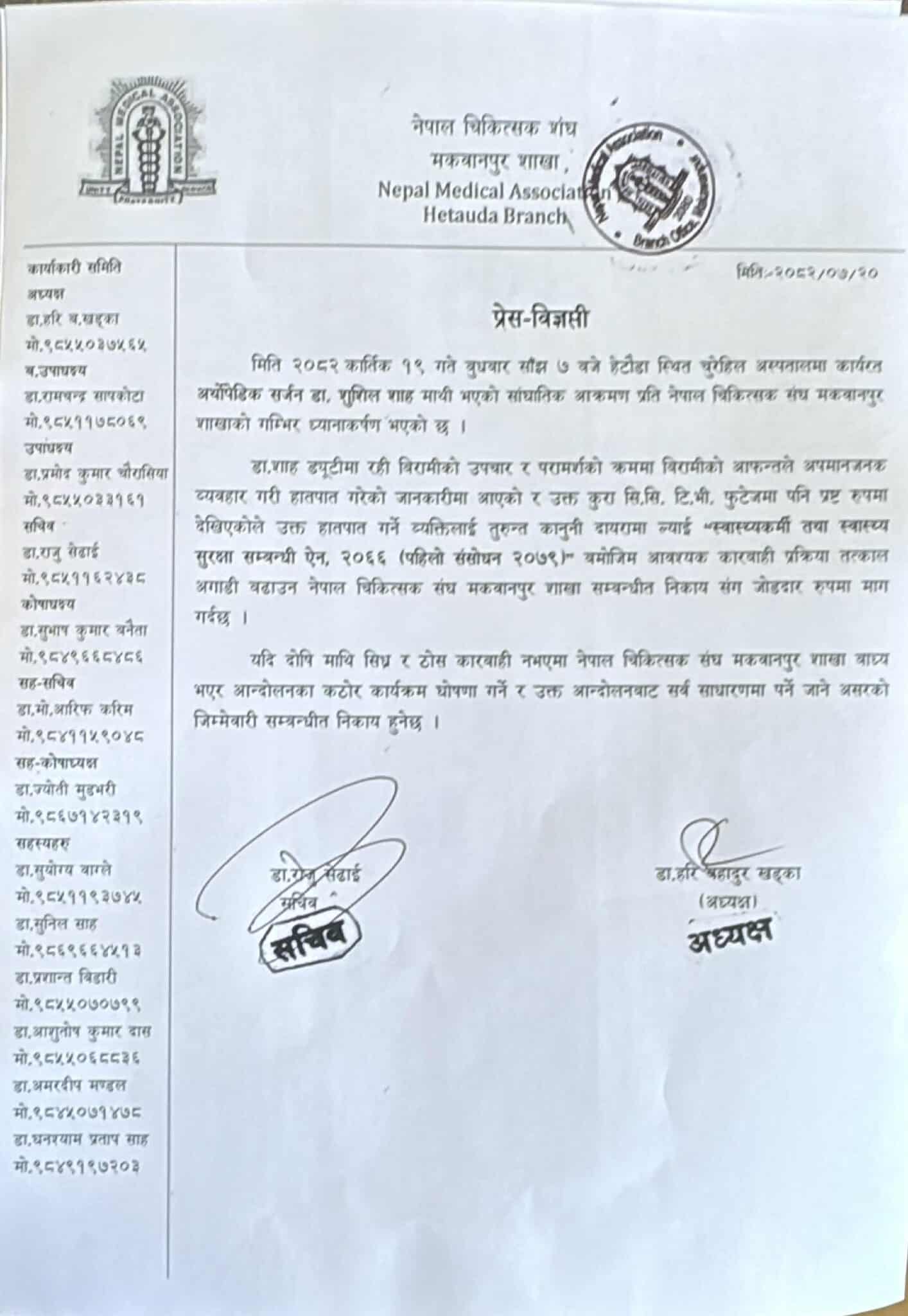 संघका अध्यक्ष डा. हरि बहादुर खड्का र सचिव डा. राजु सेढाईद्वारा हस्ताक्षरित विज्ञप्तिमा भनिएको छ, ‘यदि दोषीमाथि शीघ्र र ठोस कारबाही नभएमा नेपाल चिकित्सक संघ, मकवानपुर शाखा बाध्य भएर आन्दोलनका कठोर कार्यक्रम घोषणा गर्ने र उक्त आन्दोलनबाट सर्वसाधारणमा पर्न जाने असरको जिम्मेवारी सम्बन्धित निकाय हुनेछ ।’