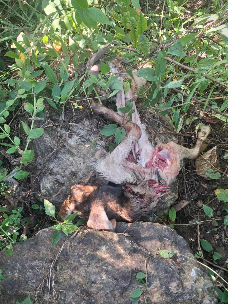 बाघको आक्रमणबाट मरेको बाख्रा ।