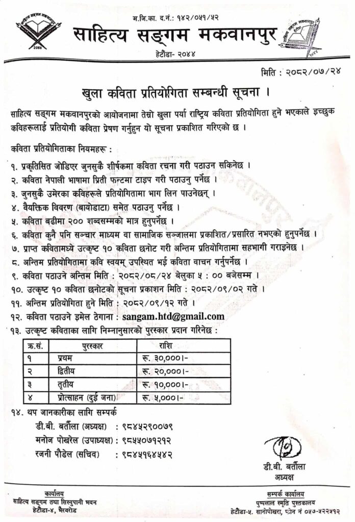 हेटौंडा : साहित्य संगम मकवानपुरको आयोजनामा तेस्रो खुला पर्या राष्ट्रिय कविता प्रतियोगिता हुने भएको छ । साहित्य संगम मकवानपुरले सोमबार एक सूचना जारी गर्दै सम्पूर्ण कविहरूलाई प्रतियोगितामा सहभागिताका लागि आह्वान गरेको छ ।