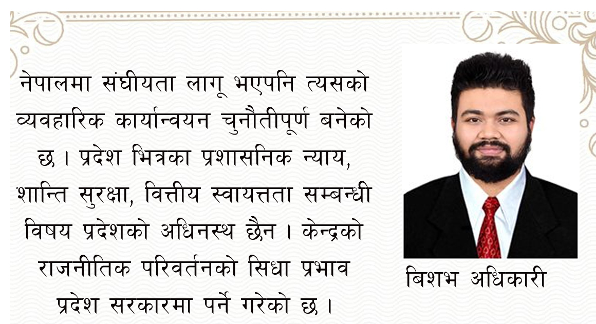 लामो एकात्मक शासन प्रणालीबाट नेपालले परिवर्तनलाई आत्मसात गर्दै गणतन्त्रतात्मक संघीय शासन प्रणालीमा प्रवेश गरेको पनि तीन दशक पार गरिसक्यो । अधिकारको बाँडफाँट, सरकारमा जनताको पहूँच, जल, जंगल, जमिन र आफ्नो भूगोलको विकास र समृद्धिको चाहनाले संघीय प्रदेश बन्यो । मूलतः संघीयता भन्नाले एउटा मुलुकलाई एकीकृत राज्यभित्र प्रदेश वा राज्यहरू रहने राजनीतिक संरचनालाई जनाउँछ, जहाँ केन्द्र र प्रदेश (या राज्य) बीचको शक्ति–वितरण, स्थानीय निर्णयशक्ति र जनसम्पर्कमा आधारित शासन कायम हुन्छ । जब यस्तो संरचना ठीक प्रकारले काम गर्छ, तब ठूलो भूगोल, विविध जाति–भाषा–संस्कृति भएका क्षेत्रहरूको प्रतिनिधित्व, स्वायत्तता र विकासका अवसर खुल्न सक्छ । तर हाल नेपालले अभ्यास गरिरहेको नाममात्रको संघीय व्यवस्था लागू भैराखेको छ । यहाँ केन्द्रको नियन्त्रण प्रचुर मात्रामा छ, प्रदेशहरू स्वायत्त हुन सकेका छैन, केन्द्र सरकारले प्रदेशलाई प्रशासनिक इकाईको रूपमा व्यवहार गरिरहेको छ ।