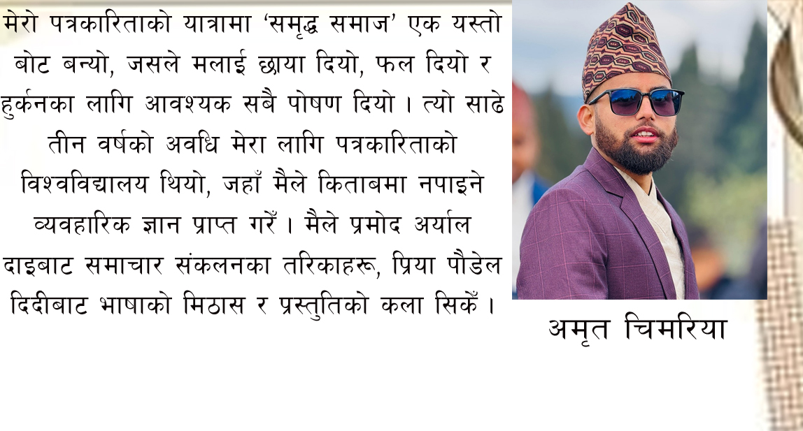 मेरो पत्रकारिताको यात्रामा ‘समृद्ध समाज’ एक यस्तो बोट बन्यो, जसले मलाई छाया दियो, फल दियो र हुर्कनका लागि आवश्यक सबै पोषण दियो । त्यो साढे तीन वर्षको अवधि मेरा लागि पत्रकारिताको विश्वविद्यालय थियो, जहाँ मैले किताबमा नपाइने व्यवहारिक ज्ञान प्राप्त गरेँ । मैले प्रमोद अर्याल दाइबाट समाचार संकलनका तरिकाहरू, प्रिया पौडेल दिदीबाट भाषाको मिठास र प्रस्तुतिको कला सिकेँ । उहाँहरूले मलाई केवल व्यावसायिक पत्रकार बन्न मात्र सिकाउनुभएन, बरु एक असल नागरिक र समाजप्रति उत्तरदायी व्यक्ति बन्न पनि प्रेरित गर्नुभयो । ती दिनहरूका हरेक अनुभव, हरेक सिकाई आज पनि मेरो मानसपटलमा ताजै छन् ।