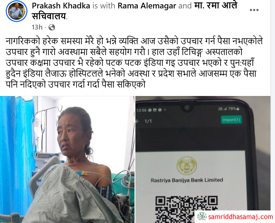 आर्थिक अभावका कारण उहाँको उपचारमा समेत समस्या भइरहेको र सहयोग उठाउन थालिएको छ । उहाँको उपचारमा सहयोग गर्न निरन्तर खटिइरहेका प्रकाश खड्काले सामाजिक सञ्जालमा प्रदेश सभा सदस्य आले मगरको फोटो र बैंक क्युआर सेयर गर्दै थप उपचारका लागि सहयोग गर्न अनुरोध गर्नुभएको छ । आले मगर बागमती प्रदेशकी एक सक्रिय र जुझारु राजनीतिज्ञका रुपमा चिनिनु हुन्छ । । उहाँ २०७४ सालमा नेकपा एमालेबाट र २०७९ सालको निर्वाचनमा नेकपा (एकीकृत समाजवादी) बाट काठमाडौं क्षेत्र नम्बर १० (ख) बाट प्रदेशसभा सदस्यमा निर्वाचित हुनुभएको हो ।