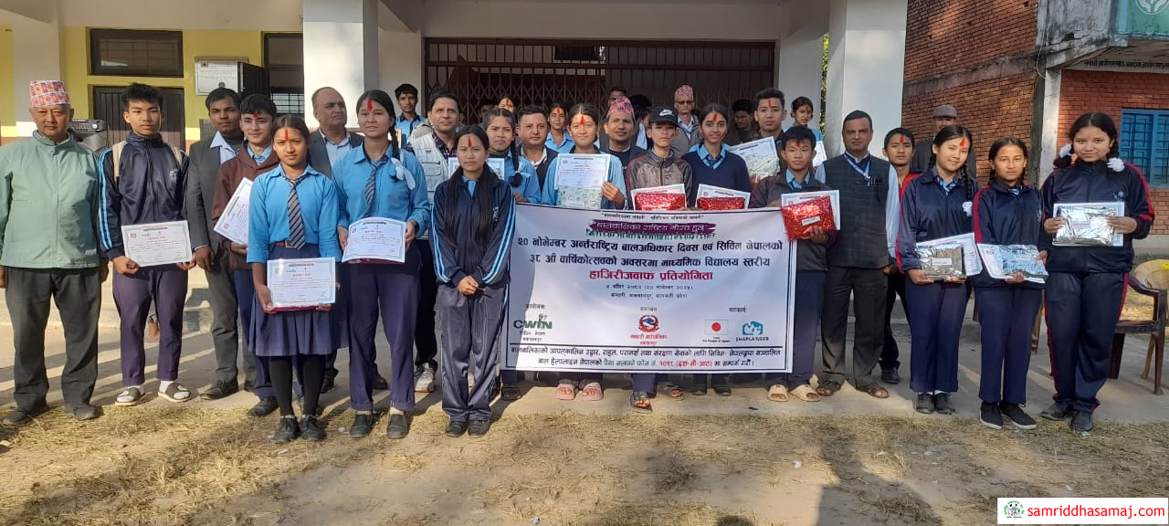 हेटौँडा : सिविन नेपाल मकवानपुरले सिविन नेपालको ३८औं वार्षिकोउत्सव एवम् अन्तर्राष्ट्रिय बालअधिकार दिवसको अवसरमा पारेर मनहरी गाउँपालिकामा १० वटा माध्यमिक विद्यालयस्तरीय हाजिरीजवाफ प्रतियोगिता सम्पन्न गरेको छ । भोजसिद्ध माध्यमिक विद्यालयमा सम्पन्न प्रतियोगितामामनहरी–१ स्थित बालजीवन ज्योति माविको समूह प्रथम, मनहरी–८ स्थित महेन्द्र किरण माविको समूह दोस्रो, मनहरी–३ स्थित प्रजा माविको समूह तेस्रो र मनहरी–४ स्थित पशुपतिनाथ माविको समूह सान्त्वना भएको छ ।