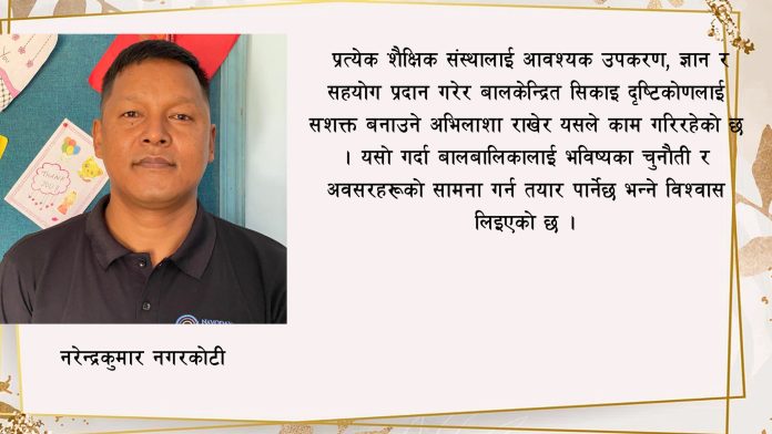 शिक्षकले कक्षाको अगाडि उभिएर जोडतोडले व्याख्यान विधिमा पढाइरहेका छैनन् । समूह–समूहमा बालबालिकालाई सघाइरहेका छन् । प्रश्न गरिरहेका छन् । बालविकासलाई ध्यानमा राखी बालबालिकाका लागि अवसर सिर्जना गर्नमा व्यस्त छन् । हरेक दिन कक्षाभित्र देखिने एउटा प्रतिनिधि दृश्य हो यो । दिनैपिच्छे क्रियाकलाप भने फरक हुन्छन् । सबै क्रियाकलापमा समान सहभागिता सुनिश्चित गरिएको हुन्छ । झट्ट हेर्दा लाग्छ नानीहरू खेलिरहेका मात्र छन् तर उनीहरू साँचो अर्थमा सिकिरहेका छन् । उनीहरू पढाइको दबाब र चपेटामा त कत्ति पनि छैनन् । खेल्दै रमाउँदै पढ्दै सिकिरहेका छन् । यो नवोदय इनोवेशन सेन्टरसँग सहकार्य गर्दै गर्दा विकास हुने सिकाइ संस्कृतिको एक झलक हो ।