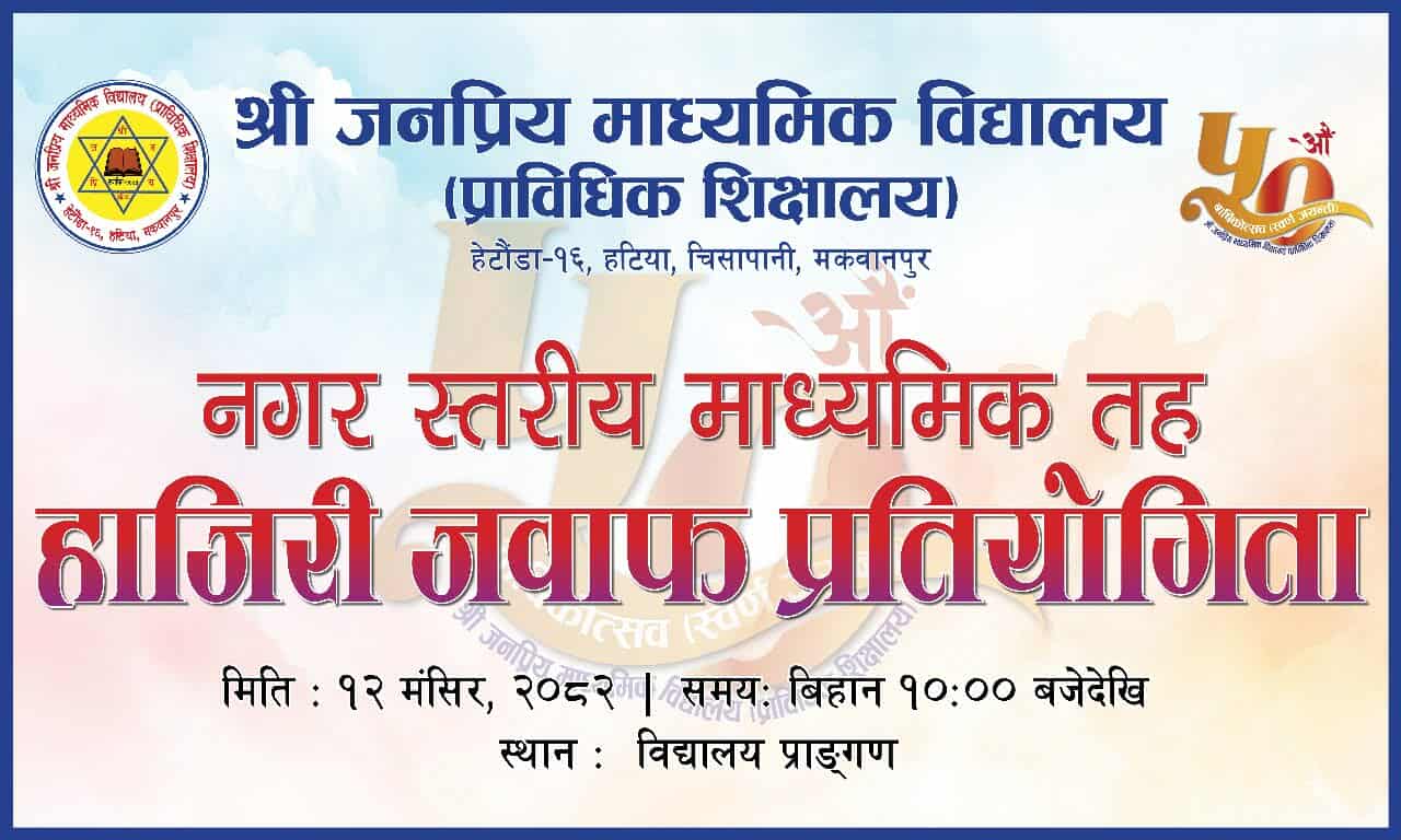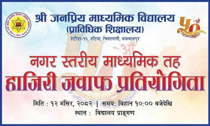हेटौंडा : हेटौंडा–१६, हटिया, चिसापानीस्थित जनप्रिय माध्यमिक विद्यालयको स्वर्ण महोत्सवको अवसरमा सप्ताहव्यापी कार्यक्रम अन्तर्गत भोलि शुक्रबार नगरस्तरीय माध्यमिक तह हाजिरीजवाफ प्रतियोगिता हुने विद्यालयका प्रधानाध्यापक भुपेन्द्र्र चौलागाईंले जानकारी दिनुभयो ।
