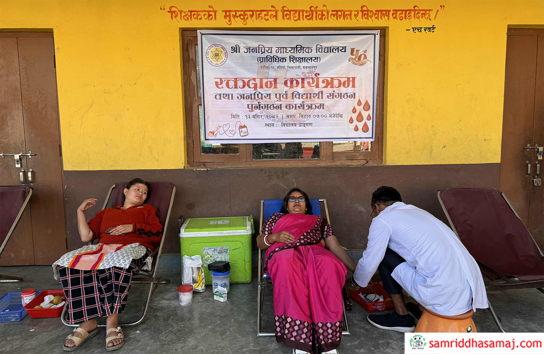 हेटौंडा : हेटौंडा–१६, हटियास्थित जनप्रिय माध्यमिक विद्यालयको आयोजनामा भएको रक्तदानमा २५ जनाले रक्तदान गरेका छन् । शनिबार विद्यालयले आयोजना गरेको रक्तदान कार्यक्रममा रक्तसञ्चार केन्द्र हेटौंडाको प्राविधिक सहयोग रहेको थियो ।