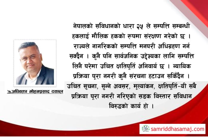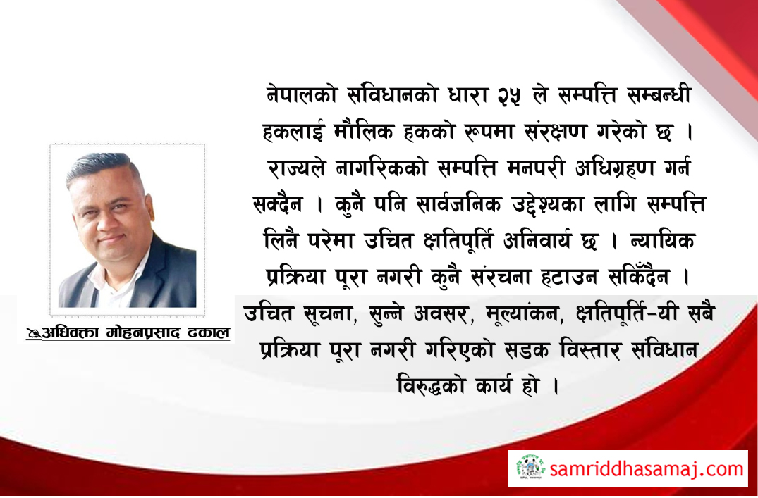 नेपालको संविधानको धारा २५ ले सम्पत्ति सम्बन्धी हकलाई मौलिक हकको रूपमा संरक्षण गरेको छ । राज्यले नागरिकको सम्पत्ति मनपरी अधिग्रहण गर्न सक्दैन । कुनै पनि सार्वजनिक उद्देश्यका लागि सम्पत्ति लिनै परेमा उचित क्षतिपूर्ति अनिवार्य छ । न्यायिक प्रक्रिया पूरा नगरी कुनै संरचना हटाउन सकिँदैन । उचित सूचना, सुन्ने अवसर, मूल्यांकन, क्षतिपूर्ति–यी सबै प्रक्रिया पूरा नगरी गरिएको सडक विस्तार संविधान विरुद्धको कार्य हो ।