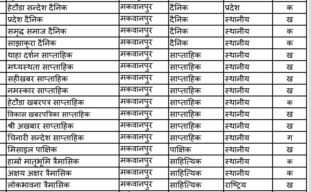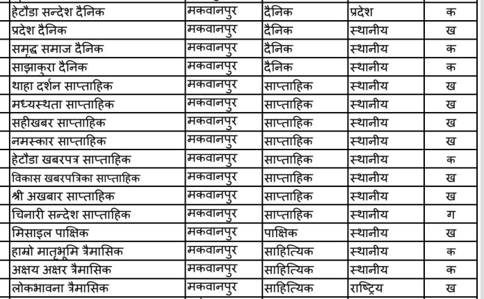 मकवानपुरबाट प्रकाशित हुने १६ वटा पत्रिका वर्गीकरणमा परेका छन् । समृद्ध समाजसँगै हेटौँडा सन्देश र साझा कुरा दैनिक ‘क’ वर्गमा वर्गीकृत भएको छ । प्रदेश दैनिक भने ‘ख’ वर्गमा वर्गीकृत भएको छ । मकवानपुरबाट प्रकाशन हुने हेटौँडा खबरपत्र साप्ताहिक ‘क’ वर्गमा वर्गीकृत भएको छ भने थाहा दर्शन, मध्यस्थता, सही खबर, नमस्कार, विकास खबरपत्रिका र अखबार साप्ताहिक ‘ख’ वर्गमा वर्गीकृत भएको छ । यस्तै चिनारी सन्देश साप्ताहिक ‘ग’ वर्गमा वर्गीकृत भएको छ । यस्तै त्रैमासिक साहित्यिक पत्रिकाहरु हाम्रो मातृभूमि र अक्षय अक्षर ‘क’ वर्गमा वर्गीकृत भएको छ । मिसाइल पाक्षिक र लोकभावना त्रैमासिक पत्रिका ‘ख’ वर्गमा वर्गीकृत भएको छ ।