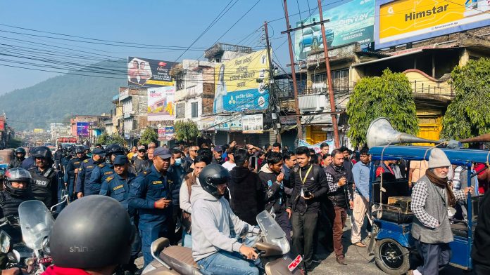 जवरजस्ती पसल तथा व्यवसायहरु बन्द गराउँदैको तस्वीर ।