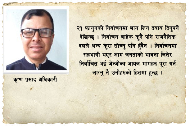 अब सत्तामा हुँदा दुई–दुई पटक गैर संवैधानिक तरिकाले निर्वाचित संंसद विघटन गर्ने र देशलाई खर्चको बोझ थुपर्ने पूर्व प्र.म. के.पी ओली अहिले यत्रो जेन्जी आन्दोलनबाट देशमा भएको सत्ता परिवर्तनलाई आत्मसाथ नगर्ने र स्विकार नगर्ने तहमा पुग्नु दुर्भाग्य मान्न सकिन्छ । राष्ट्रपतिले संविधानको धारा टेकेर गठन गरेको सरकारप्रति लान्छन् । लगाउने एक मात्र दल एमाले बनेको छ । त्यस्तो सरकारले विघटन गरेको सांसद पुनस्थापना हुनुपर्छ भन्नु फेरि पुन आफै नै प्र.म. बन्ने दुस्साहसबाट प्रेरित छ । त्यसलाई रोक्न निर्वाचन अपरिहार्य छ । ओली नेतृत्वको ने.का. मिश्रित सरकार कुचोले बढार्नुपर्ने कसिंगर हावाले उठाएर लग्या भने जस्तै भएको छ । हालै मात्र ने.का. पार्टीले पनि फागुन २१ गतेको निर्वाचनमा सहभागीता जनाउँने निर्णय गरेको छ । निर्वाचन आयोगमा दल दर्ता गरेका अन्य सबै पार्टीहरु पनि निर्वाचनकै पक्षमा रहेको अवस्थामा ने.क.पा. एमाले मात्र यसको विपक्षमा छ । अब सबै दलहरु मिलेर चुनाबमा भाग लिई नयाँ सरकार बनाई संविधान संसोधन मार्फत जेन्जीका मागहरु सम्बोधन गर्न तिर लाग्नु अहिलेको देशको आवश्यकता हो ।