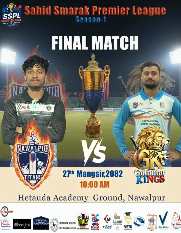 हेटौंडाः सहिद स्मारक प्रिमियर लिगको फाइनल खेलमा नवलपुर टाइटन्स र गोल्फिन्टार किङ्स भिड्ने भएको छ । अंक तालिकाको शीर्ष दुई स्थानमा रहेका यी टोलीले उपाधिका लागि शनिबार प्रतिस्पर्धा गर्नेछ ।