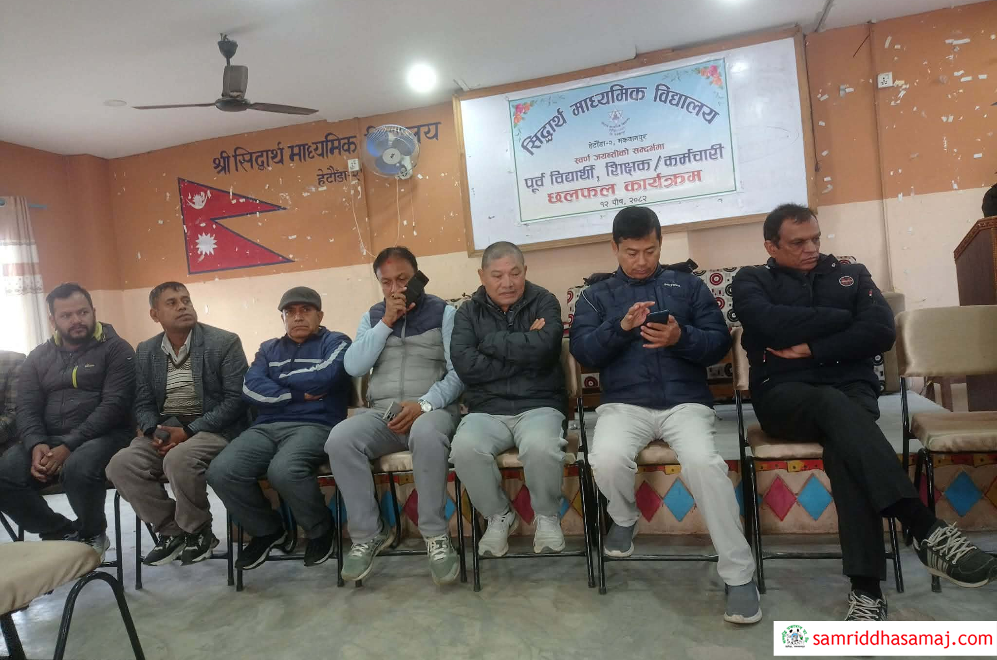 हेटौँडा : हेटौँडा–२ स्थित सिद्धार्थ माध्यमिक विद्यालयले स्थापनाको ५० औँ वर्षको अवसरमा स्वर्ण जयन्ती मनाउने भएको छ । आगामी माघ २ गतेदेखि ८ गतेसम्ममा विविध कार्यक्रमको आयोजना गरी स्वर्ण जयन्ती मनाउने भएको हो । स्वर्ण जयन्तीको तयारीको क्रममा विद्यालयले शनिबार विद्यालयको हलमा पूर्वविद्यार्थी, शिक्षक र कर्मचारीहरुसँग छलफल गरेको छ ।