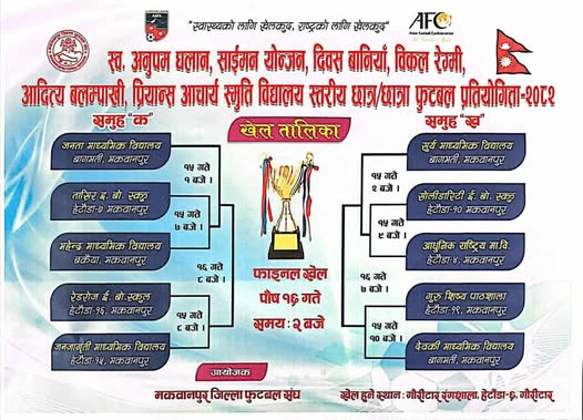मंगलबार बिहान ७ बजेदेखि बागमती गाउँपालिकाको जनता माध्यमिक विद्यालय र हेटौँडा–७ स्थित तासिर इङ्लिस बोर्डिङ स्कूलबिच हुनेछ । यस्तै, ८ बजेदेखि हेटौँडा–१५ स्थित जनजागृति माध्यमिक विद्यालय र हेटौँडा–१६ स्थित रेडरोज इङ्लिस बोर्डिङ स्कूलबिच खेल हुनेछ । मंगलबार नै बिहान ९ बजेदेखि बागमतीका सूर्य माध्यमिक विद्यालय र हेटौँडा–१० स्थित सोलिडायरिटी इङ्लिस बोर्डिङ स्कूलबिच र १० बजेदेखि हेटौँडा–१५ स्थित गुरु शिष्य पाठशाला र बागमतीको देवकी माध्यमिक विद्यालयबिचको खेल हुँदैछ ।