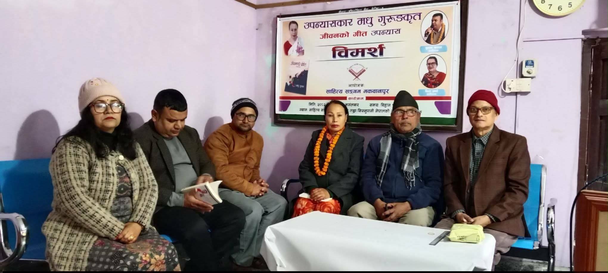 हेटौँडाः मोरङ जिल्लाको बेलबारी निवासी उपन्यासकार मधु गुरुङको ‘जीवनको गीत’ उपन्यासमाथि हेटौँडामा विमर्श कार्यक्रम सम्पन्न भएको छ । मंगलबार साहित्य सङ्गम मकवानपुरको आयोजनामा हेटौँडा–४, भैरवरोडस्थित साहित्य सङ्गम मकवानपुर तथा सिस्नुपानी नेपालको सभाहलमा कार्यक्रम भएको हो ।