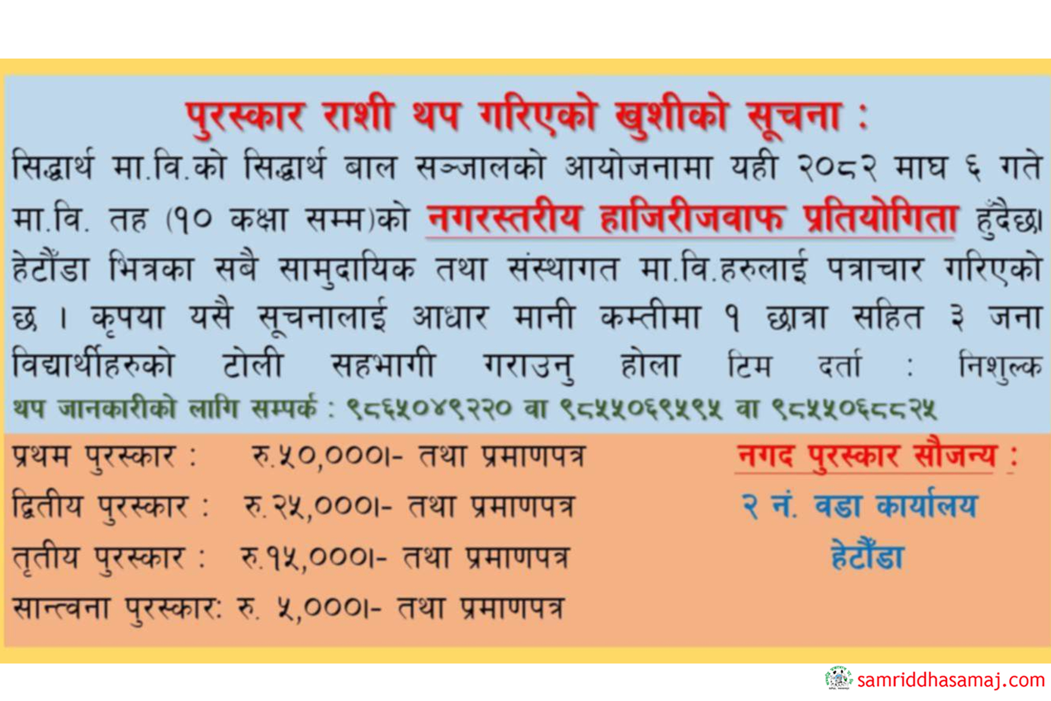 हेटौँडा : हेटौँडा–२ स्थित सिद्धार्थ माध्यमिक विद्यालयले स्वर्ण महोत्सवको रुपमा प्रथम पुरस्कार ५० हजार रुपैयाँको हाजिरीजवाफ प्रतियोगिता आयोजना गर्दैछ । १० कक्षासम्म अध्ययनरत विद्यार्थीको सहभागिता रहने प्रतियोगिता माघ ६ गते आयोजना हुनेछ ।