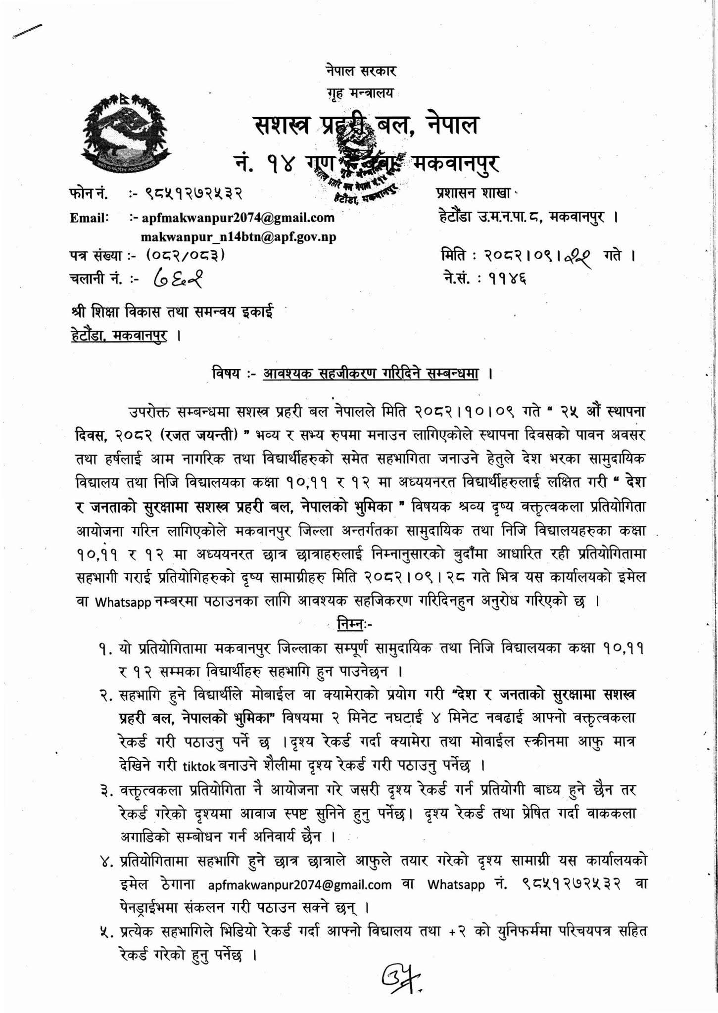 मंगलबार सशस्त्र प्रहरी बल नेपाल, १४ नम्बर गण मकवानपुरले सूचना जारी गरी जिल्लाभरिका सामुदायिक तथा निजी विद्यालयलाई सहभागिताको लागि आह्वान गरेको छ । वक्तृत्वकला प्रतियोगिताको शीर्षक ‘देश र जनताको सुरक्षामा सशस्त्र प्रहरी बल, नेपालको भूमिका’ रहेको छ । प्रतियोगितामा कक्षा १०, ११ र १२ मा अध्ययनरत विद्यार्थीहरु सहभागी हुन पाउनेछन् ।