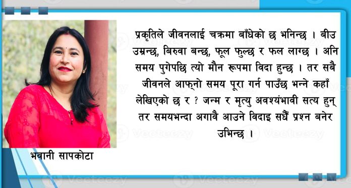 प्रकृतिले जीवनलाई चक्रमा बाँधेको छ भनिन्छ । बीउ उम्रन्छ, बिरुवा बन्छ, फूल फुल्छ र फल लाग्छ । अनि समय पुगेपछि त्यो मौन रूपमा विदा हुन्छ । तर सबै जीवनले आफ्नो समय पूरा गर्न पाउँछ भन्ने कहाँ लेखिएको छ र ? जन्म र मृत्यु अवश्यंभावी सत्य हुन् तर समयभन्दा अगावै आउने विदाइ सधैँ प्रश्न बनेर उभिन्छ ।