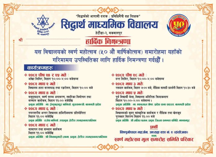 हेटौँडा : हेटौँडा–२ स्थित सिद्धार्थ माध्यमिक विद्यालयले स्वर्ण महोत्सव (५० औँ वार्षिकोत्सव) समारोह विविध कार्यक्रमको आयोजना गरी मनाउन लागेको छ । विद्यालयले विभिन्न कार्यक्रममार्फत विद्यार्थी, पूर्वविद्यार्थी र शिक्षकहरूलाई सहभागी गराउँदै स्वर्ण महोत्सव मनाउने तयारी गरेको छ ।