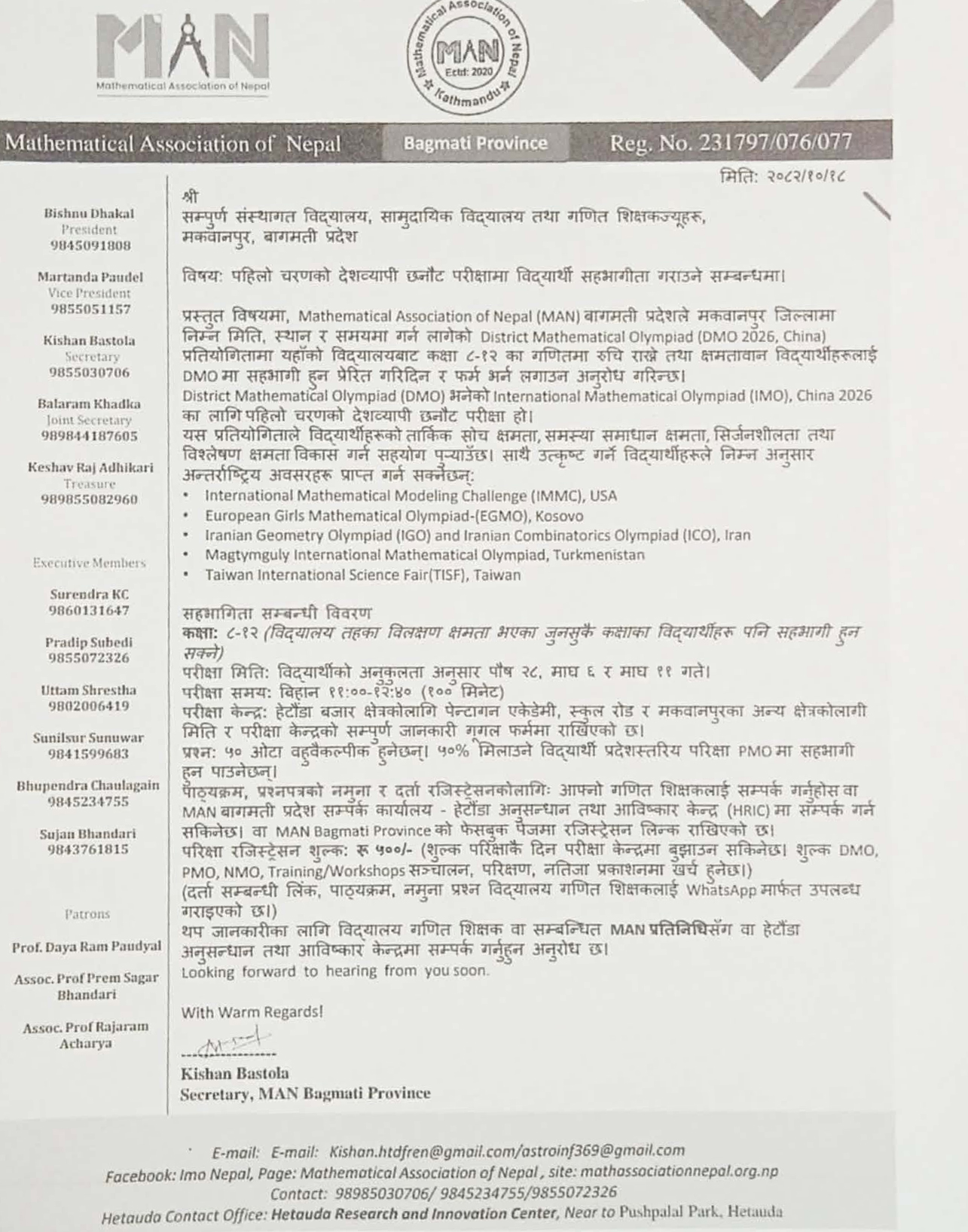 आगामी जुलाई १० देखि २० तारिखसम्म चीनमा हुने ६७ औँ अन्तर्राष्ट्रिय म्याथमेटिकल ओलम्पियाड (आइएमओ) का लागि यो पहिलो चरणको देशव्यापी छनोट परीक्षा हो । जिल्लास्तरको परीक्षामा उत्तीर्ण हुने विद्यार्थीहरू प्रदेश हुँदै राष्ट्रियस्तरको नेपाल म्याथमेटिकल ओलम्पियाडमा सहभागी हुन पाउनेछन् । राष्ट्रिय परीक्षामा उत्कृष्ट ६ भित्र पर्ने विद्यार्थीहरूले चीनमा हुने अन्तर्राष्ट्रिय प्रतियोगितामा नेपालको प्रतिनिधित्व गर्दै सहभागिता जनाउने म्याथमेटिकल एसोसिएसन अफ नेपाल बागमतीका सचिव किशन बास्तोलाले जानकारी दिनुभयो ।