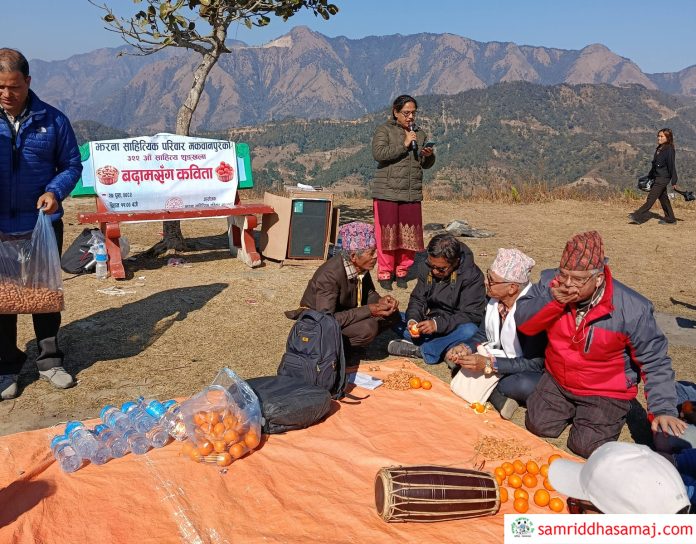 हेटौँडा : झरना साहित्यिक परिवार मकवानपुरले पुस महिनाको नियमित मासिक कार्यक्रम अन्तर्गत आइतबार मकवानपुरको ऐतिहासिक स्थल ढुङ्गेगढीमा ‘बदामसँग कविता’ कार्यक्रम सम्पन्न गरेको छ । झरना साहित्यिक परिवारकी अध्यक्ष गायत्री रुपाखेतीको सभाध्यक्षता तथा महाकाव्यकार मुना अर्यालको प्रमुख आतिथ्यमा कार्यक्रम भएको हो ।