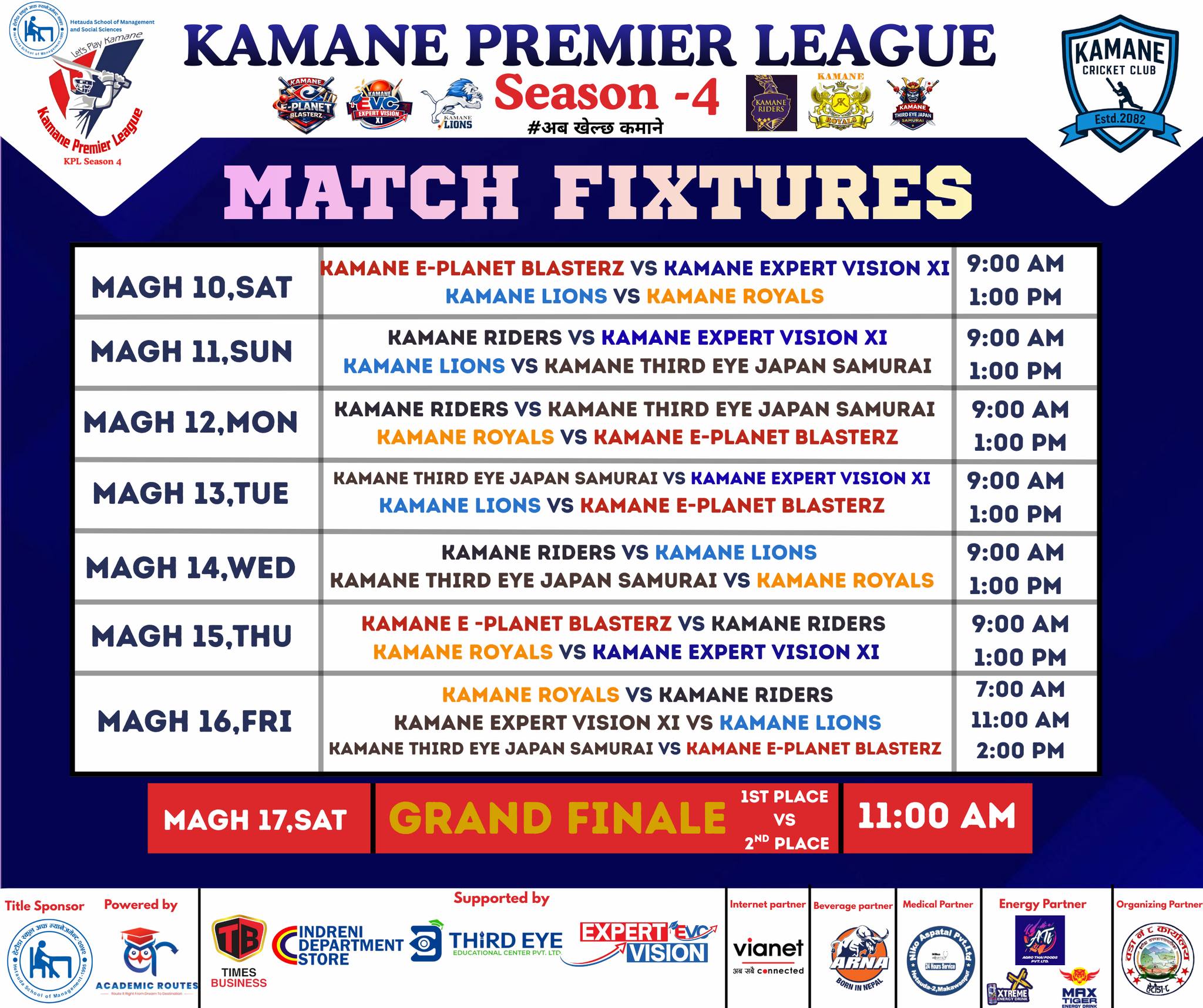 प्रतियोगिताको उद्घाटन खेलमा कमाने इप्लानेट ब्लास्टर्स र कमाने एक्सपोर्टस् भिजन–११ भिड्ने छन् । सोही दिन हुने दोस्रो खेलमा शुभ कंसाकार सम्मिलित कमाने लायन्स र साविक उपविजेता कमाने रोयल्स भिड्ने छन् । प्रतियोगितामा कमाने थर्डआई र कमाने राइडर्ससमेत ६ वटा टोलीको सहभागिता रहनेछ ।