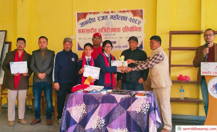 हेटौँडा : हेटौँडा–५ स्थित ज्ञानदीप बहुउद्देश्यीय सहकारी संस्था लिमिटेड र ज्ञानदीप शिक्षा (जीएस) निकेतनको रजत महोत्सवको अवसरमा आधारभूत तहस्तरीय हाजिरीजवाफ प्रतियोगितामा हेटौँडा–३ स्थित सनसाइन इंग्लिस बोर्डिङ स्कूल प्रथम भएको छ ।