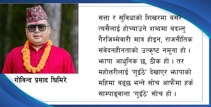विडम्बना के छ भने, यिनै नेताहरू राष्ट्रिय एकता, भाषिक सद्भाव र सामाजिक समावेशीताका ठूला भाषण दिन पछि पर्दैनन् । तर व्यवहारमा भने भाषालाई हतियार बनाएर राजनीति गर्छन् । भूगोललाई चिढ्याएर ताली खोज्छन् । समुदायलाई होच्याएर शक्ति प्रदर्शन गर्छन् ।