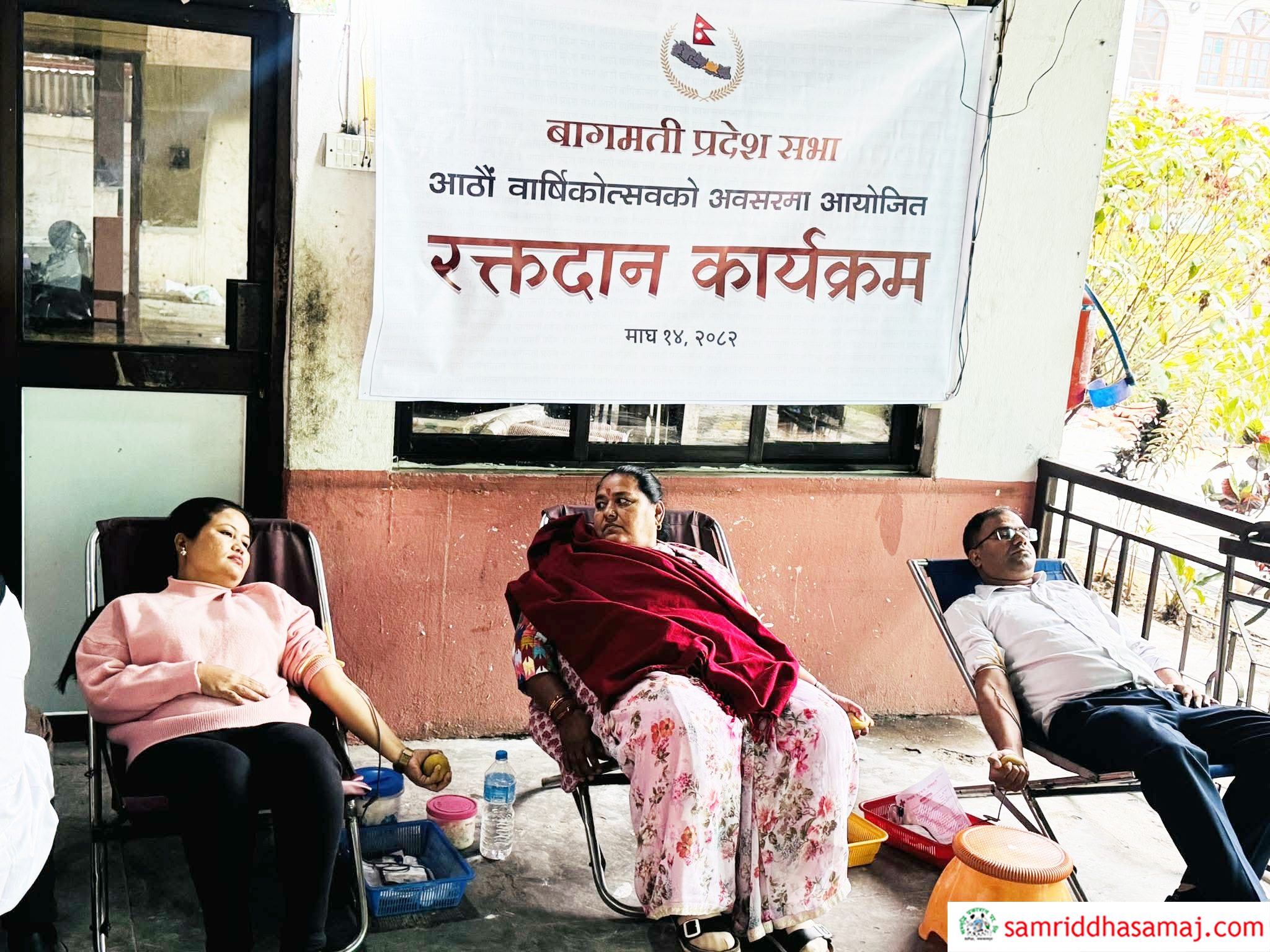 हेटौँडा : बागमती प्रदेश सभाको आयोजनामा भएको रक्तदानमा १६ जनाले रक्तदान गरेका छन् । बुधबार प्रदेश सभाको आठौँ वार्षिकोत्सवको अवसरमा आयोजित रक्तदान कार्यक्रमको उद्घाटन उपसभामुख अप्सरा चापागाईले रक्तदान गरेर गर्नुभएको थियो ।