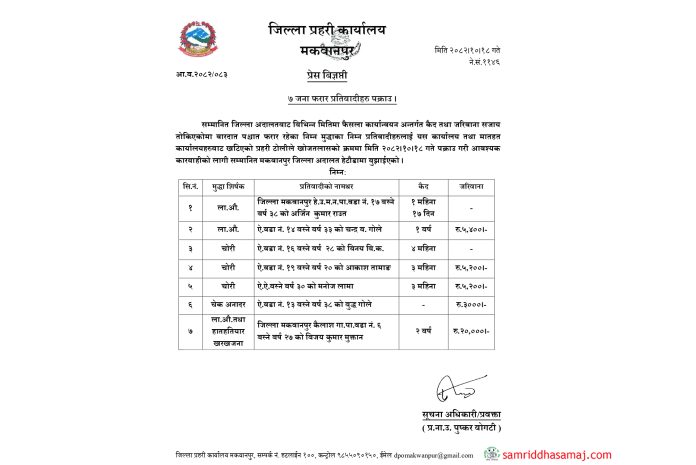 यस्तै, चेक अनादर मुद्दामा ३ हजार रुपैयाँ जरिवाना तोकिएका हेटौँडा–१३ का ३८ वर्षीय बुद्ध गोले र लागूऔषध तथा हातहतियार खरखजना मुद्दामा २ वर्ष कैद र २० हजार रुपैयाँ जरिवाना तोकिएका कैलाश गाउँपालिका–६ का २७ वर्षीय विजय कुमार मुक्तान पक्राउ परेका छन् । पक्राउ परेकाहरुलाई मकवानपुर जिल्ला अदालतमा पेश गरी आवश्यक कारवाही अगाडि बढाइएको प्रहरीले जनाएको छ ।