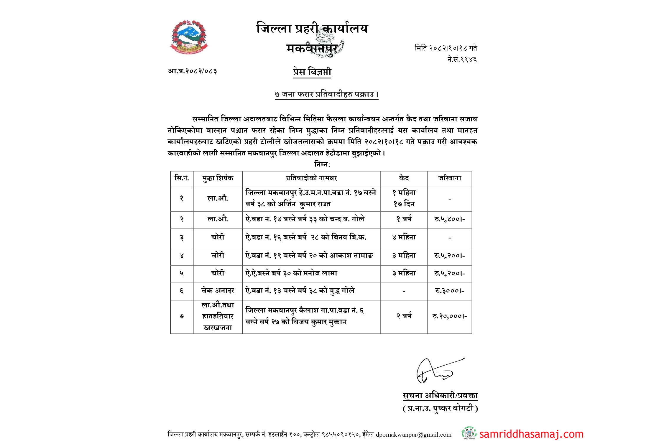 पक्राउ पर्नेमा लागुऔषध मुद्दामा १ महिना १७ दिन सजाय तोकिएका हेटौँडा–१७ का ३८ वर्षीय अर्जिन कुमार राउत र १ वर्ष कैद र ५ हजार ४ सय रुपैयाँ जरिवाना तोकिएका हेटौँडा–१४ का ३३ वर्षीय चन्द्रबहादुर गोले रहेका छन् । यसैगरी चोरी मुद्दामा दोषी ठहर भई ४ महिना कैद तोकिएका हेटौँडा–१६ का २८ वर्षीय विनय बिक, ३÷३ महिना कैद र ५ हजार २ सय रुपैयाँ जरिवाना तोकिएका हेटौँडा–१९ का २० वर्षीय आकाश तामाङ र ३० वर्षीय मनोज लामा पक्राउ परेका छन् ।