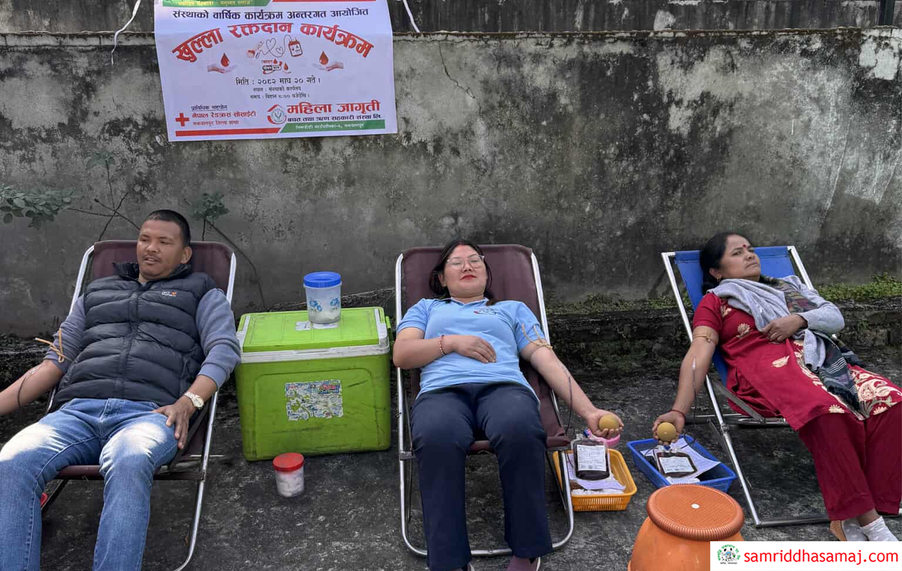 हेटौँडा : मकवानपुरको भीमफेदी गाउँपालिका–६ मा रहेको महिला जागृति बचत तथा ऋण सहकारी संस्था लिमिटेडको आयोजनामा भएको रक्तदानमा १९ जनाले रक्तदान गरेका छन् । मंगलबार संस्थाको वार्षिक कार्यक्रम अन्तर्गत रक्तदान कार्यक्रम भएको रक्तसञ्चार केन्द्र हेटौँडाका प्राविधिक किशोर सापकोटाले जानकारी दिनुभयो ।
