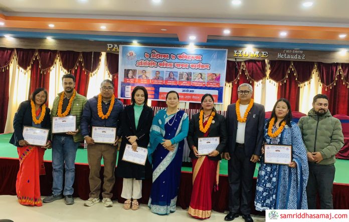 हेटौँडा : देशका सातै प्रदेशका कविहरुले हेटौँडामा आफ्ना रचना वाचन गरेका छन् । शनिबार प्रगतिशील लेखक संघ मकवानपुरको आयोजनामा भएको कार्यक्रममा देशका सातै प्रदेशका ७ जना कविहरुले आफ्ना प्रदेशको प्रतिनिधि कविता वाचन गरेका हुन् ।