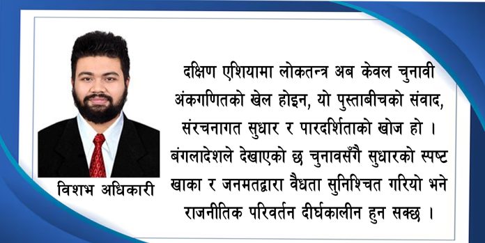 दक्षिण एशियामा लोकतन्त्र अब केवल चुनावी अंकगणितको खेल होइन, यो पुस्ताबीचको संवाद, संरचनागत सुधार र पारदर्शिताको खोज हो । बंगलादेशले देखाएको छ चुनावसँगै सुधारको स्पष्ट खाका र जनमतद्वारा वैधता सुनिश्चित गरियो भने राजनीतिक परिवर्तन दीर्घकालीन हुन सक्छ । नेपालले पनि यो क्षणलाई केवल सरकार परिवर्तनको अवसर नभई शासन प्रणाली परिमार्जनको अवसरका रूपमा लिनुपर्छ । प्रश्न अब केवल कसले बहुमत ल्याउँछ ? भन्ने होइन । प्रश्न हो कसले प्रणालीलाई भविष्यका लागि तयार बनाउँछ ? यदि जेन जीहरुको आवाज, नागरिक समाजको दबाव र सुधारमुखी राजनीतिक इच्छाशक्ति एउटै दिशामा उभिए भने नेपालमा पनि आगामी चुनाव केवल सत्ताको फेरबदल मात्र नभई लोकतन्त्रको पुनर्जन्म बन्न सक्छ । अस्तु ।।।