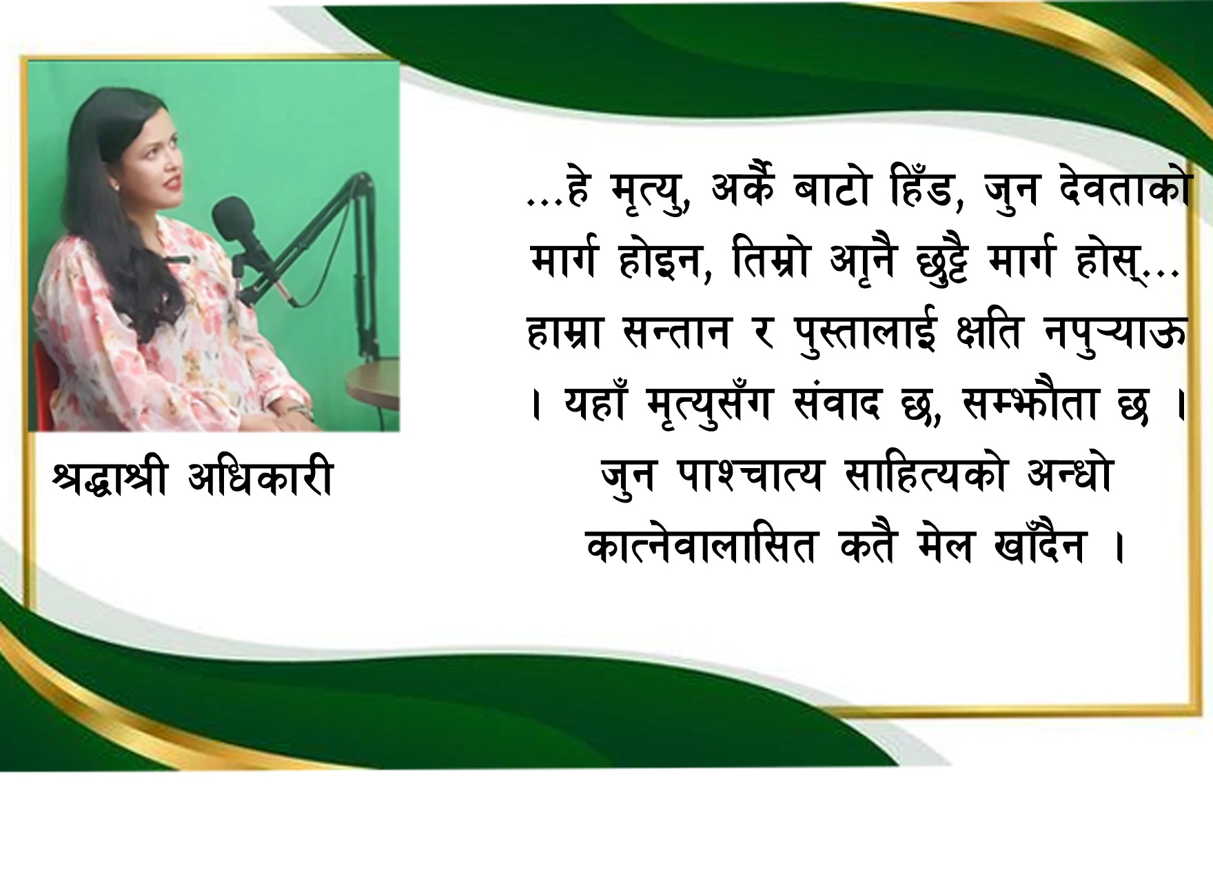 ‘हे मृत्यु, अर्कै बाटो हिँड, जुन देवताको मार्ग होइन, तिम्रो आफ्नै छुट्टै मार्ग होस्… हाम्रा सन्तान र पुस्तालाई क्षति नपुर्याऊ ।’
