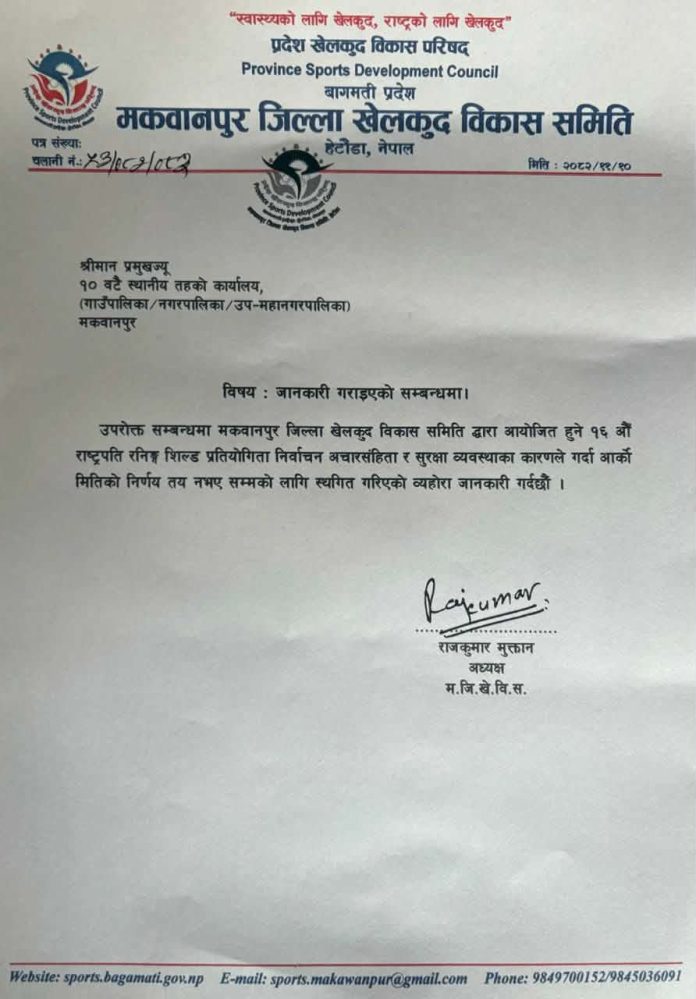 समितिले आइतबार सूचना जारी गरी अर्को निर्णय नभएसम्मका लागि प्रतियोगिता स्थगित गरिएको जनाएको छ । गत माघ २५ गते हेटौँडा–४ स्थित जिल्ला खेलकुद विकास समितिको कार्यालयमा अध्यक्ष मोक्तानको सभाध्यक्षतामा बसेको बैठकले फागुन ११ गतेदेखि १३ गतेसम्म प्रतियोगिता आयोजना गर्ने निर्णय गरेको थियो । यो प्रदेशस्तरीय राष्ट्रपति रनिङशिल्ड प्रतियोगिताका लागि छनोट प्रतियोगिता हो ।