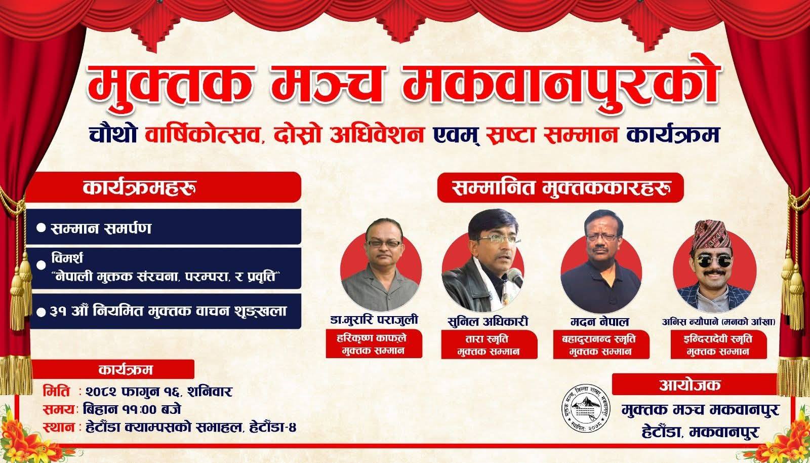 हेटौँडा : मुक्तक मञ्च मकवानपुरको चौथो वार्षिकोत्सव तथा दोस्रो अधिवेशन आज शनिबार हुँदैछ । हेटौँडा–४ स्थित हेटौँडा क्याम्पसको सभाहलमा कार्यक्रम आयोजना हुन लागेको मञ्चले जनाएको छ ।
