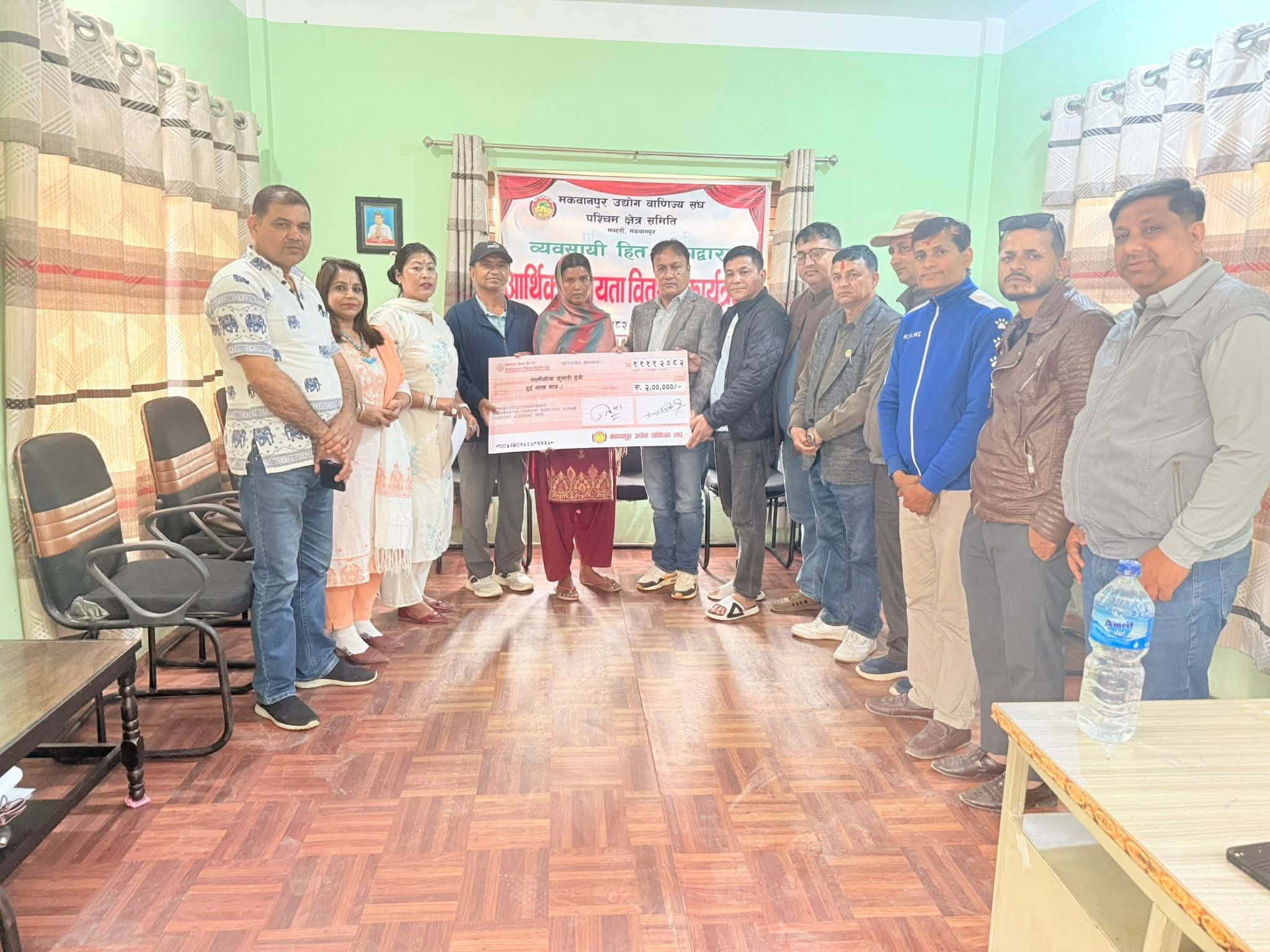 हेटौँडा : मकवानपुर उद्योग वाणिज्य संघले आफ्नो सदस्य व्यवसायीको निधन भएपछि उनका परिवारलाई आर्थिक सहायता प्रदान गरेको छ । उद्योग वाणिज्य संघ व्यवसायी हितकोषद्वारा मनहरी निवासी स्वर्गीय नरेश साह सोनारको परिवारलाई २ लाख रुपैयाँ प्रदान गरिएको हो ।