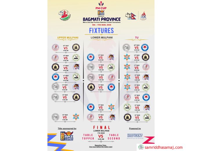 हेटौँडा : पुरुष एक दिवसीय प्रधानमन्त्री कप क्रिकेट प्रतियोगिता–२०८२ का लागि बागमती प्रदेशस्तरीय छनोट प्रतियोगिता सोमबारदेखि हुने भएको छ । बागमती प्रदेश क्रिकेट संघले शुक्रबार छनोट प्रतियोगिताको खेल तालिका सार्वजनिक गरेको छ ।