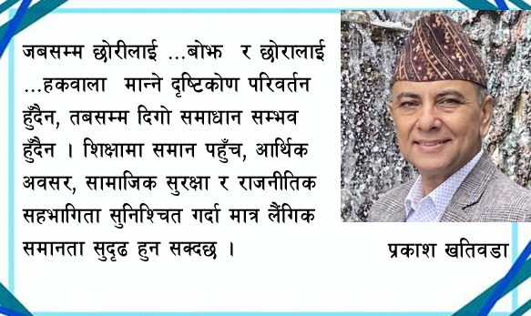 अन्तर्राष्ट्रिय स्तरमा महिला विरुद्धका सबै प्रकारका भेदभाव उन्मूलन गर्ने सम्बन्धी महासन्धी १९७९, आर्थिक–सामाजिक–साँस्कृतिक अधिकारको अभिसन्धी १९६६, विश्वव्यापी आवधिक समीक्षा प्रक्रिया तथा दिगो विकास लक्ष्यहरू (विशेषतः लक्ष्य ३, ५, ८, १०, १३ र १६) मार्फत राज्यले गरेका प्रतिबद्धताहरू व्यवहारमा कार्यान्वयन गर्न, गराउन निरन्तर पैरवी आवश्यक छ । कानुन र नीतिको प्रभावकारी कार्यान्वयनले मात्र पितृसत्तात्मक सोचमा रूपान्तरण ल्याउन सकिन्छ । पितृसत्तात्मक संरचना र सोच नै बालविवाह तथा लैंगिक हिंसाको मूल कारण हो भन्नुमा अत्युक्ति नहोला । जबसम्म छोरीलाई ‘बोझ’ र छोरालाई ‘हकवाला’ मान्ने दृष्टिकोण परिवर्तन हुँदैन, तबसम्म दिगो समाधान सम्भव हुँदैन । शिक्षामा समान पहुँच, आर्थिक अवसर, सामाजिक सुरक्षा र राजनीतिक सहभागिता सुनिश्चित गर्दा मात्र लैंगिक समानता सुदृढ हुन सक्दछ । त्यसैले यस बारेमा गम्भिर हुने बेला भएको छ ।