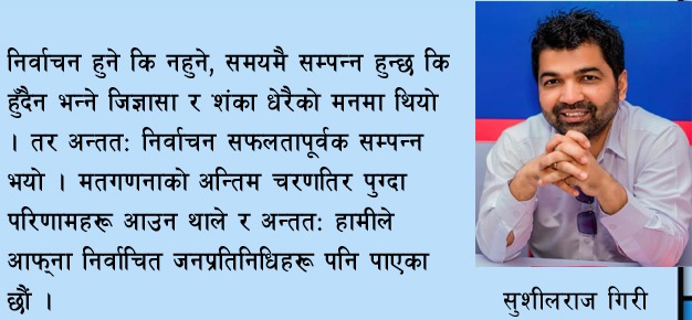 निर्वाचन हुने कि नहुने, समयमै सम्पन्न हुन्छ कि हुँदैन भन्ने जिज्ञासा र शंका धेरैको मनमा थियो । तर अन्ततः निर्वाचन सफलतापूर्वक सम्पन्न भयो । मतगणनाको अन्तिम चरणतिर पुग्दा परिणामहरू आउन थाले र अन्ततः हामीले आफ्ना निर्वाचित जनप्रतिनिधिहरू पनि पाएका छौँ ।