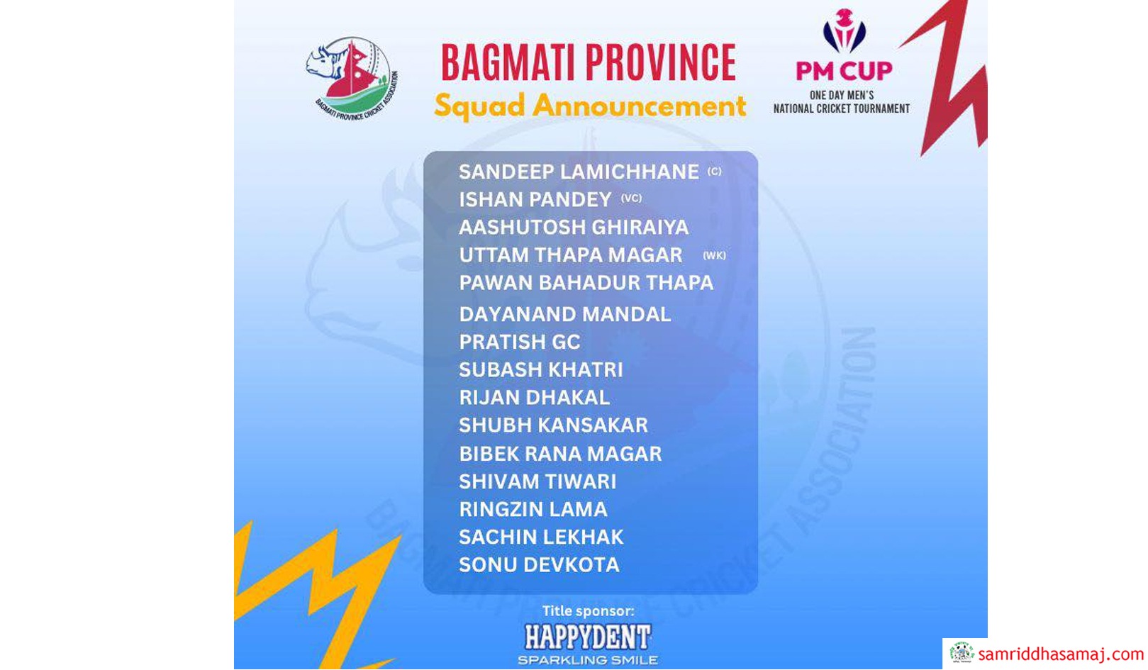 संघले नेपाली राष्ट्रिय क्रिकेट टोलीका सदस्य सन्दिप लामिछानेको नेतृत्वमा बुधबार १५ सदस्यीय टोली घोषणा गरेको हो । टोलीमा ललितपुरका विवेक राना मगर, सचिन लेखक र आशुतोष घिरैया समावेश छन् । काठमाडौंका ईशान पाण्डे उपकप्तान रहेको उक्त टोलीमा काठमाडौंका अन्य खेलाडी उत्तम थापा मगर, दयानन्द मण्डल, प्रतिश जिसि र सोनु देवकोटा पनि पर्न सफल भएका छन् । यस्तै भक्तपुरका शिवम् तिवारी, सुवास खत्री र रिन्जिन लामासहित चितवनका पवनबहादुर थापा छनोट भएका छन् ।