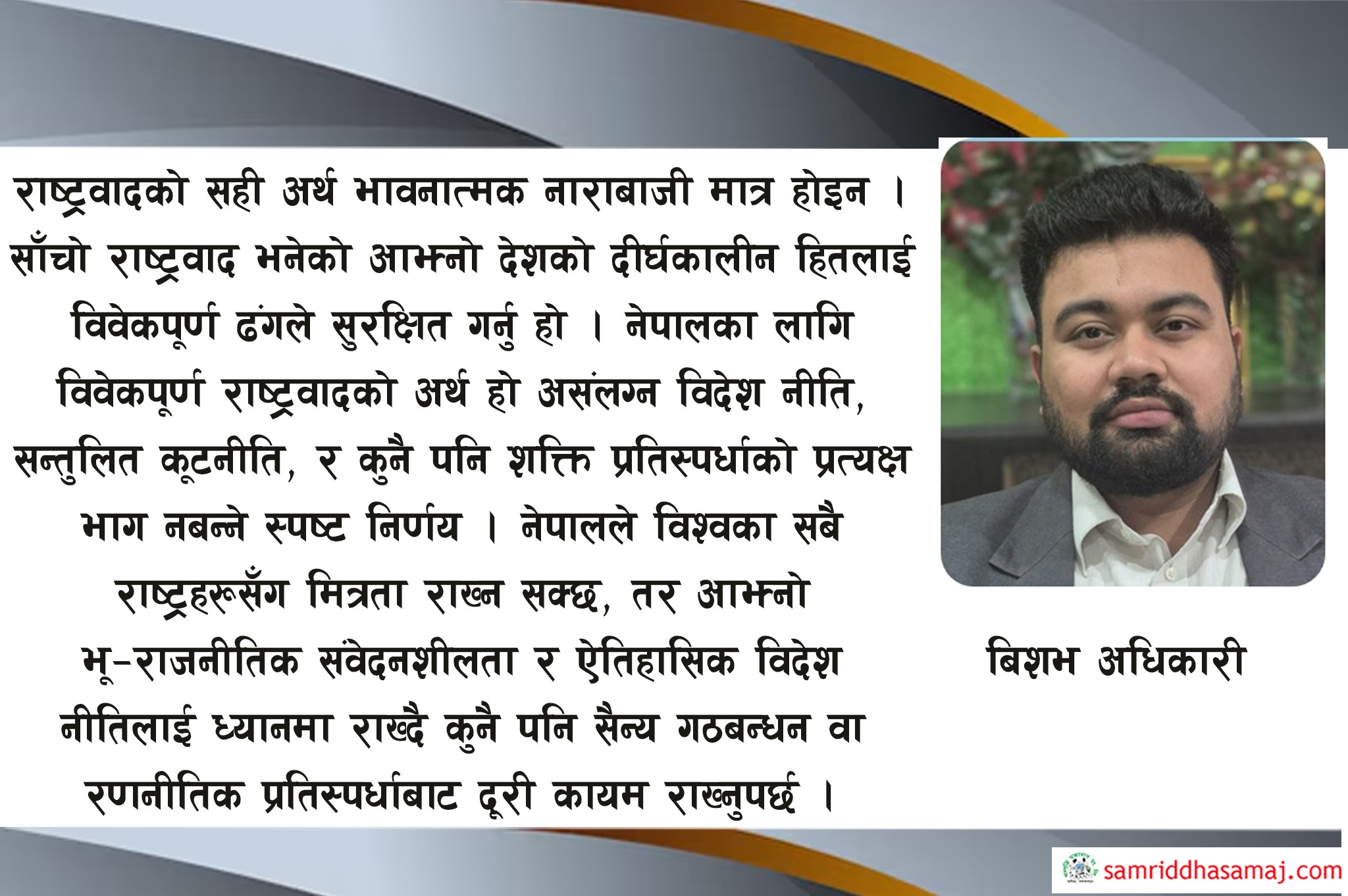 राष्ट्रवादको सही अर्थ भावनात्मक नाराबाजी मात्र होइन । साँचो राष्ट्रवाद भनेको आफ्नो देशको दीर्घकालीन हितलाई विवेकपूर्ण ढंगले सुरक्षित गर्नु हो । नेपालका लागि विवेकपूर्ण राष्ट्रवादको अर्थ हो असंलग्न विदेश नीति, सन्तुलित कूटनीति, र कुनै पनि शक्ति प्रतिस्पर्धाको प्रत्यक्ष भाग नबन्ने स्पष्ट निर्णय । नेपालले विश्वका सबै राष्ट्रहरूसँग मित्रता राख्न सक्छ, तर आफ्नो भू–राजनीतिक संवेदनशीलता र ऐतिहासिक विदेश नीतिलाई ध्यानमा राख्दै कुनै पनि सैन्य गठबन्धन वा रणनीतिक प्रतिस्पर्धाबाट दूरी कायम राख्नुपर्छ ।