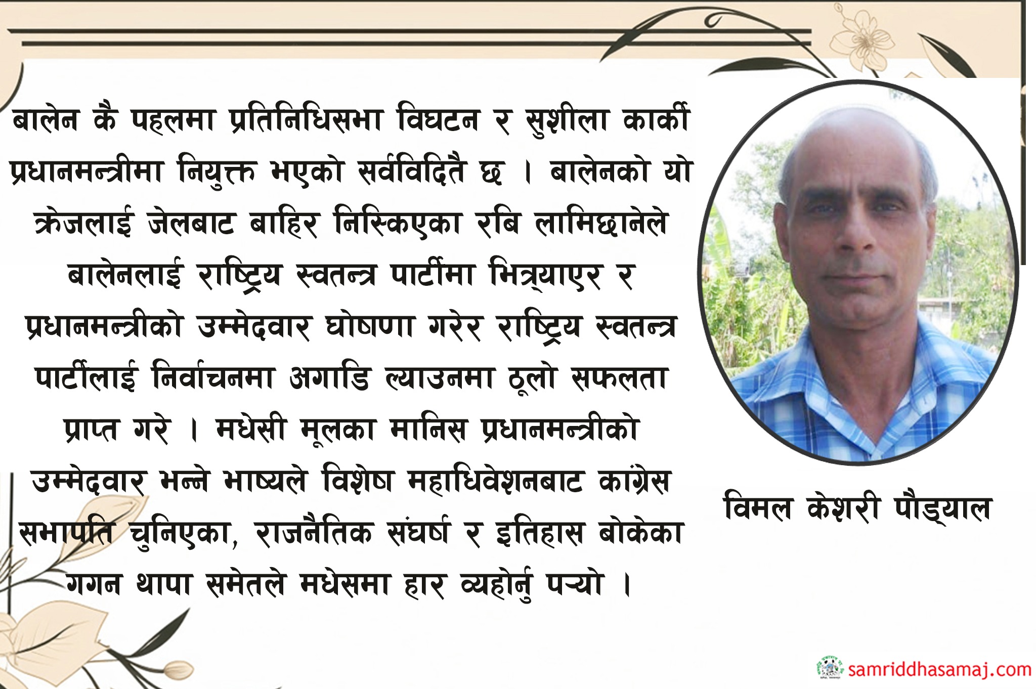 २०८२ सालको प्रतिनिधिसभा सदस्य निर्वाचनमा राष्ट्रिय स्वतन्त्र पार्टी (रास्वपा) ले दुइतिहाई बहुमत ल्याएको छ भने परम्परागत राजनैतिक पार्टीहरु कांग्रेस, एमाले र नेपाली कम्युनिष्ट पार्टीले लज्जास्पद पराजय भोगेका छन् । प्रजातन्त्र प्राप्ति तथा राष्ट्रियता, जनजीविका, संघीयता, धर्म निरपेक्षता, समानुपातिक समावेशी जस्ता मुद्दाहरुलाई सशक्त उठाउँदै वर्षौंसम्म संघर्ष गरेका कांग्रेस, कम्युनिष्ट र मधेशवादी दलहरु नराम्ररी पछारिएका छन् । यो अभूतपूर्व सफलता राष्ट्रिय स्वतन्त्र पार्टीको समर्थनमा उर्लेको नभई स्थापित राजनैतिक शक्तिहरुप्रतिको आक्रोश, वितृष्णा र छटपटीको अभिव्यक्ति हो भनेर बुझ्नु पर्छ । समग्रमा सम्पूर्ण परिस्थितिको विश्लेषण र आगामी लिनुपर्ने बाटोका बारेमा समीक्षा गर्ने प्रयास गरिएको छ ।