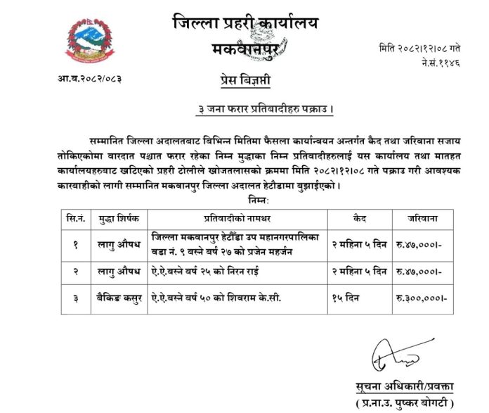 पक्राउ पर्नेहरुमा लागूऔषध सम्बन्धी मुद्दामा समान २ महिना ५ दिन कैद र ४७ हजार रुपैयाँ जरिवाना सजाय पाएका हेटौँडा–९ का २७ वर्षीय प्रजेन महर्जन र २५ वर्षीय निरन राई रहेका छन् । यस्तै, बैंकिङ कसुरमा १५ दिन कैद र ३ लाख रुपैयाँ जरिवाना सजाय पाएका हेटौँडा–९ का ५० वर्षीय शिवराम केसी पक्राउ परेका छन् । पक्राउ परेका प्रतिवादीहरुलाई आवश्यक कारबाहीका लागि मकवानपुर जिल्ला अदालतमा बुझाइएको प्रहरीले जानकारी दिएको छ ।