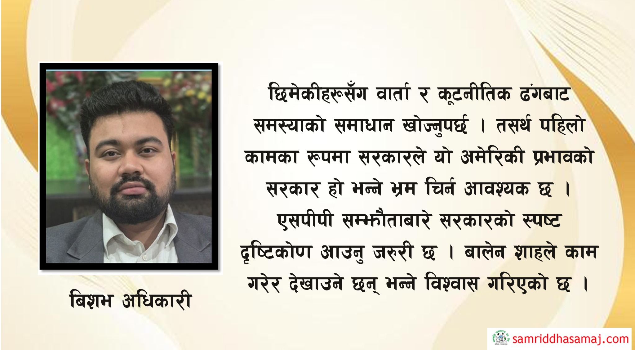 छिमेकीहरूसँग वार्ता र कूटनीतिक ढंगबाट समस्याको समाधान खोज्नुपर्छ । तसर्थ पहिलो कामका रूपमा सरकारले यो अमेरिकी प्रभावको सरकार हो भन्ने भ्रम चिर्न आवश्यक छ । एसपीपी सम्झौताबारे सरकारको स्पष्ट दृष्टिकोण आउनु जरुरी छ । बालेन शाहले काम गरेर देखाउने छन् भन्ने विश्वास गरिएको छ । भाषणभन्दा काम महत्वपूर्ण हुन्छ भन्ने उदाहरणका रूपमा केल्भिन कोलिजलाई लिन सकिन्छ । अमेरिकामा सन् १९२४ देखि १९२९ सम्म राष्ट्रपति रहँदा उनले पत्रकारसँग अत्यन्त कम बोले । सार्वजनिक मञ्चमा पनि थोरै शब्द मात्र प्रयोग गर्ने उनी काममा विश्वास गर्थे । फलस्वरूप, उनको कार्यकालमा अमेरिकी अर्थतन्त्रले ठूलो फड्को मारेको थियो ।
