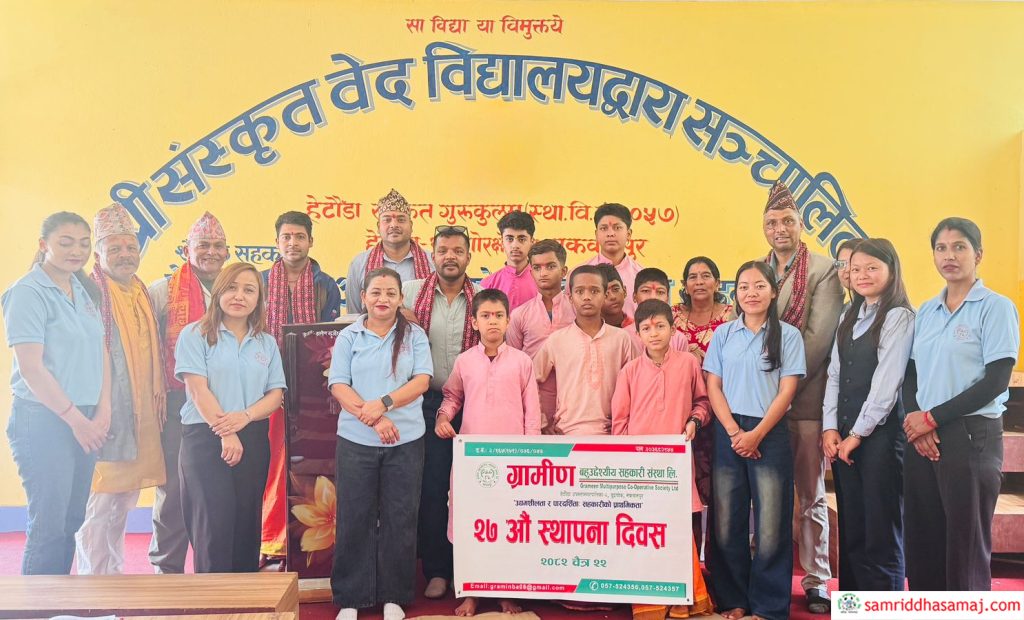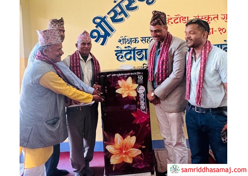 हेटौँडा : हेटौँडा–२, बुद्धचोकस्थित ग्रामीण बहुउद्देश्यीय सहकारी संस्था लिमिटेडले स्थापना दिवसको अवसरमा हेटौँडा–१० स्थित संस्कृत वेद विद्यालयलाई फ्रिज सहयोग गरेको छ । आइतबार सहकारीको २७औं स्थापना दिवसको अवसरमा विद्यालयलाई २७ हजार पाँच सय रुपैयाँ मूल्यको फ्रिज हस्तान्तरण गरिएको हो ।
