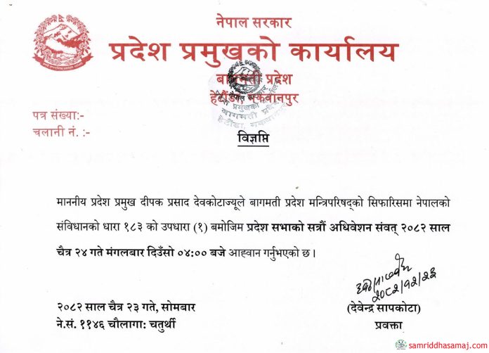 प्रदेश सरकारको आइतबार बसेको मन्त्रिपरिषद् बैठकको सिफारिसमा नेपालको संविधानको धारा १८३ को उपधारा (१) बमोजिम प्रदेश प्रमुख देवकोटाले प्रदेश सभाको सत्रौं अधिवेशन भोलि चैत्र २४ गते मंगलबार दिउँसो ४ बजेका लागि आव्हान गर्नुभएको हो । प्रदेश सभाको वर्षे अधिवेशन अन्त्य भएको ५ महिनापछि सरकारले हिउँदे अधिवेशन आव्हान गरेको हो । गत मंसिर ३ मा प्रदेश सरकारको सिफारिसमा प्रदेश प्रमुख देवकोटाले प्रदेश सभाको चालु वर्षे अधिवेशन अन्त्य गर्नुभएको थियो । जेनजी आन्दोलन र विपद्का कारण सरकारले प्रदेशसभा बैठक बोलाउन नसक्दा विगत ८ महिना प्रदेशसभा बैठक बस्न सकेको थिएन । गत साउन २७ मा प्रदेशसभाको अन्तिम बैठक बसेको थियो ।